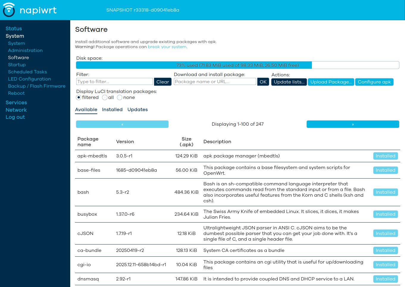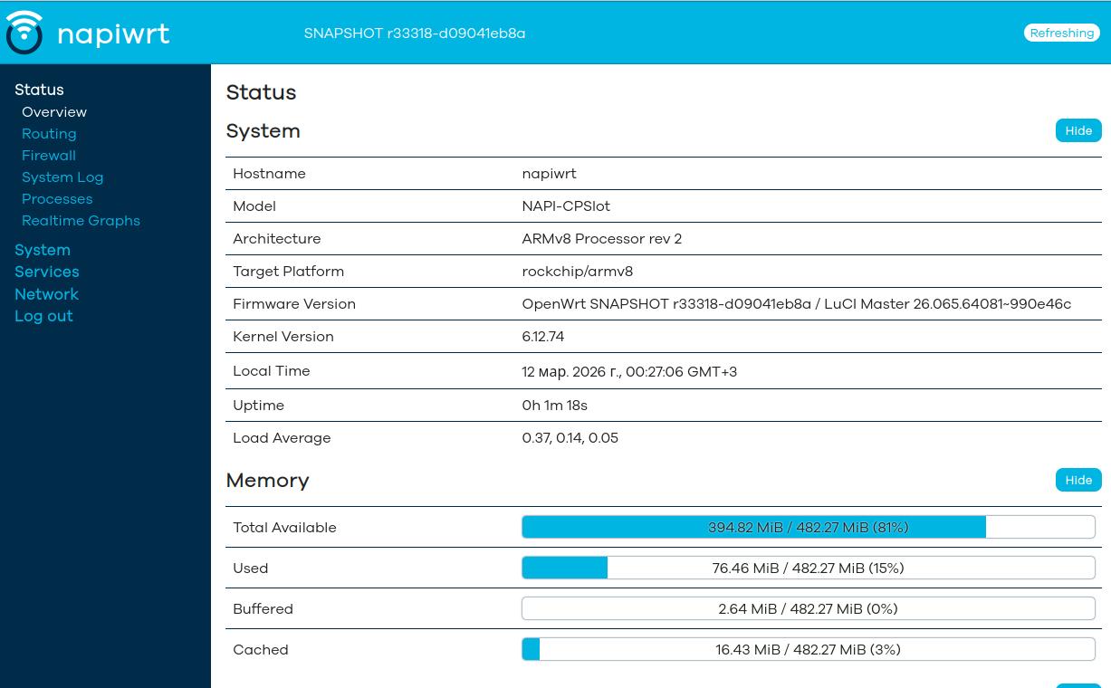 Ванильный OpenWrt доступен для "родственной" платы RockPi-S, но не знает особенностей Napi: нет device tree дополнительных портов, нет правильной конфигурации U-Boot, нет пакетов для промышленного применения. Наш репозиторий — это наб ор патчей, DTS, uci-defaults и пакетов, которые превращают чистый снапшот OpenWrt в готовый промышленный одноплатник.