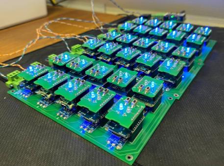 Датчиками у нас выступают микроко нтроллеры Wemos D1 mini (на основе MK ESP8266), интерфейсом опроса - RS485. Датчики собраны на принципиальных платах по 10шт на плате. Сейчас у нас в работе 3 платы по 10 датчиков.